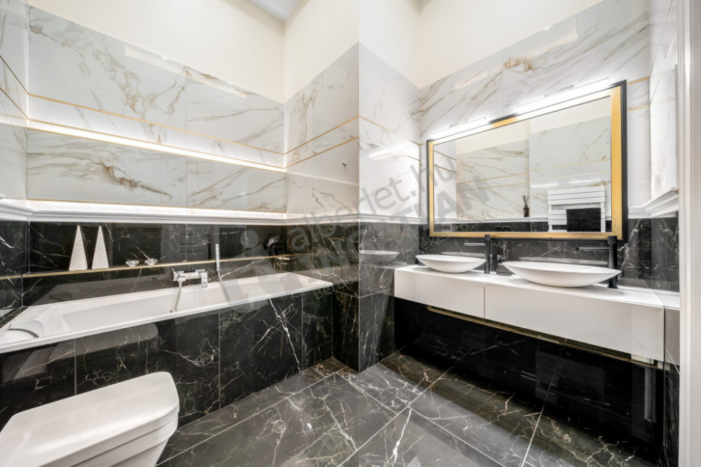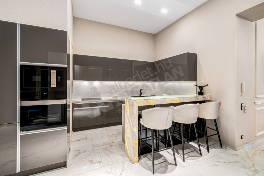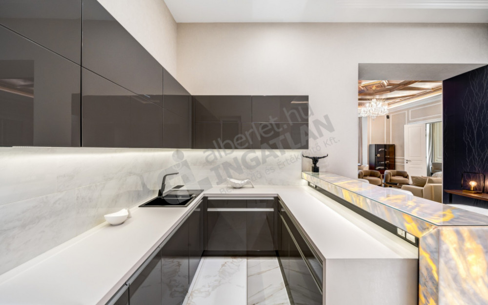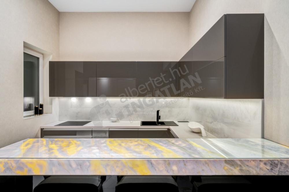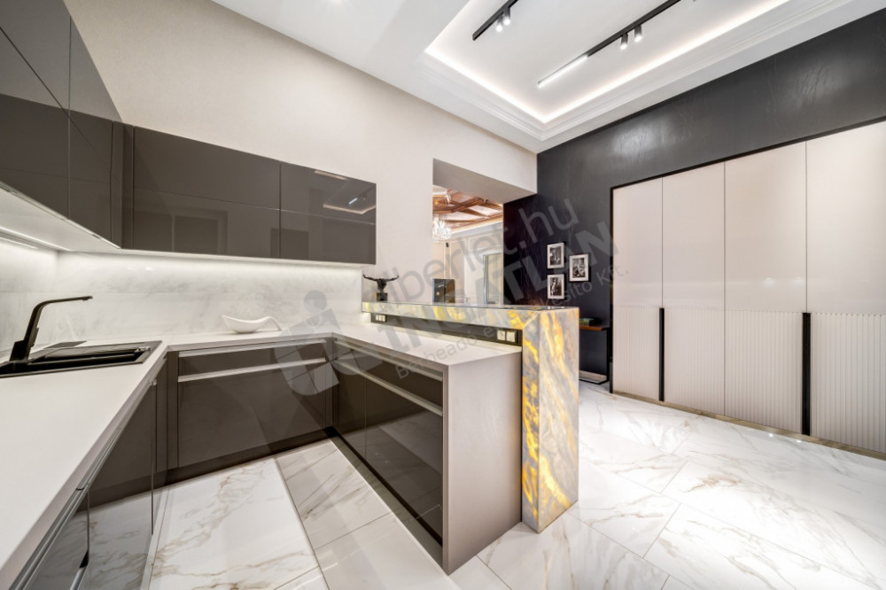 The kitchen is fully mechanized (with Gorenje, Electrolux and Zanussi appliances), and the kitchen furniture was also made based on individual designs. The marble bar counter, which closes the kitchen island and is illuminated with cold and warm light, gives the space a special emphasis.