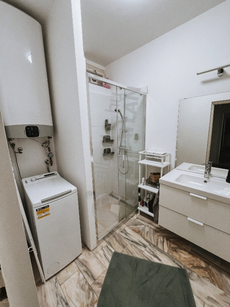 In the walk-in closet, two built-in wardrobes provide plenty of storage space. Through this room we can access the bathroom with shower and washing machine.